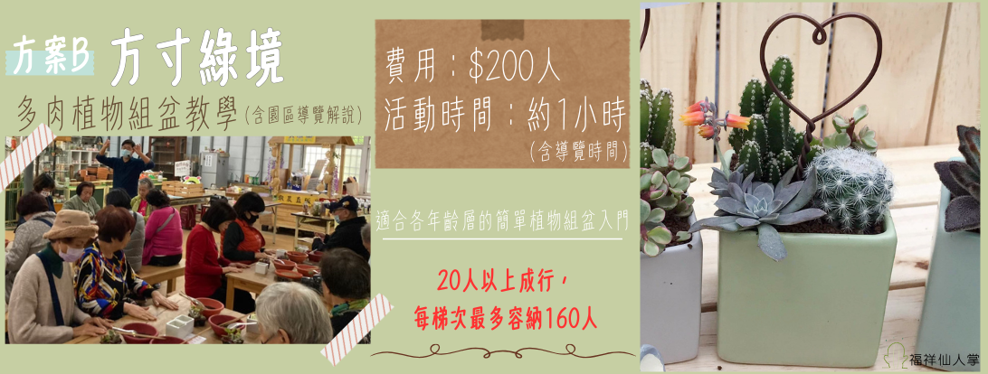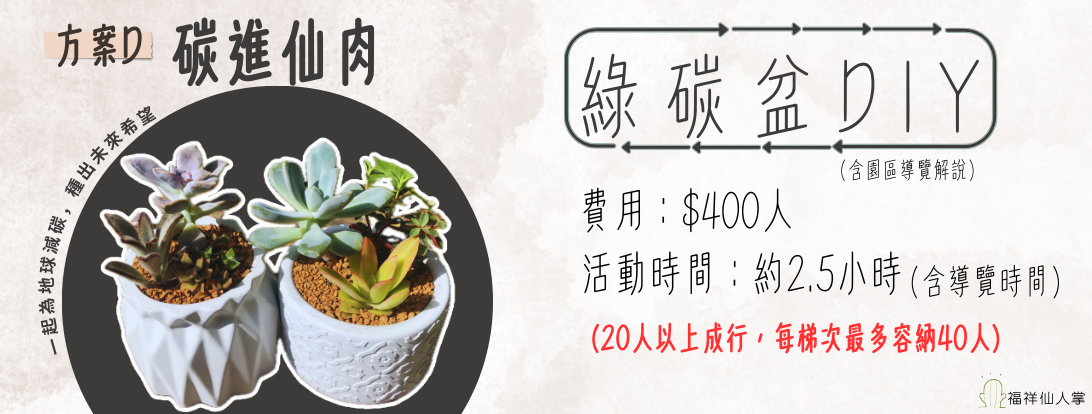 製作固碳盆+園區導覽解說+多肉植物組盆教學,活動時間長約2.5小時,建議停留2.5~3小時。