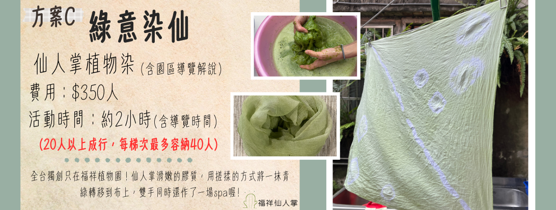 仙人掌植物染教學約1.5~2小時,導覽時間約20分鐘,建議停留時間1.5~2小時